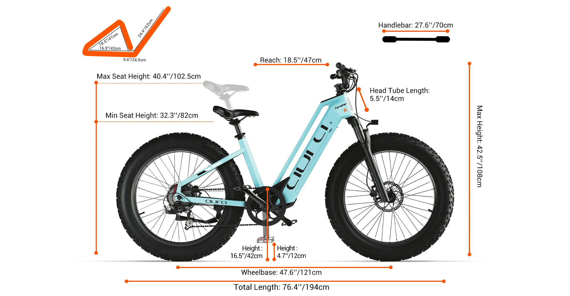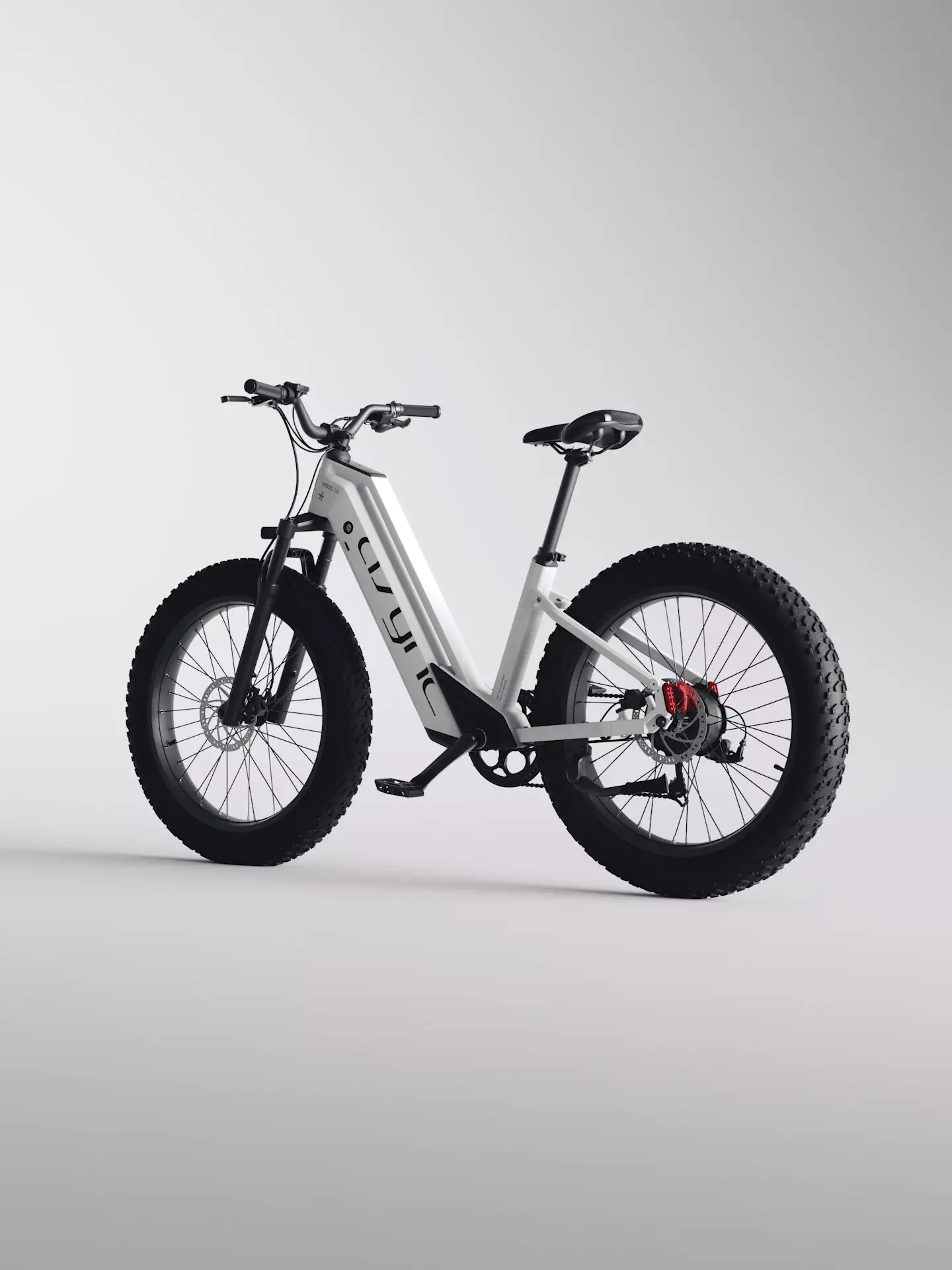 Fahre über jede Oberfläche mit der Federung des Aura und den CST 26” * 4.0” Reifen und Federung. Regen oder Schnee, keine Sorge. Das Fahrrad ist IPX5 wasserdicht (einige Teile sind IPX7 wasserdicht).