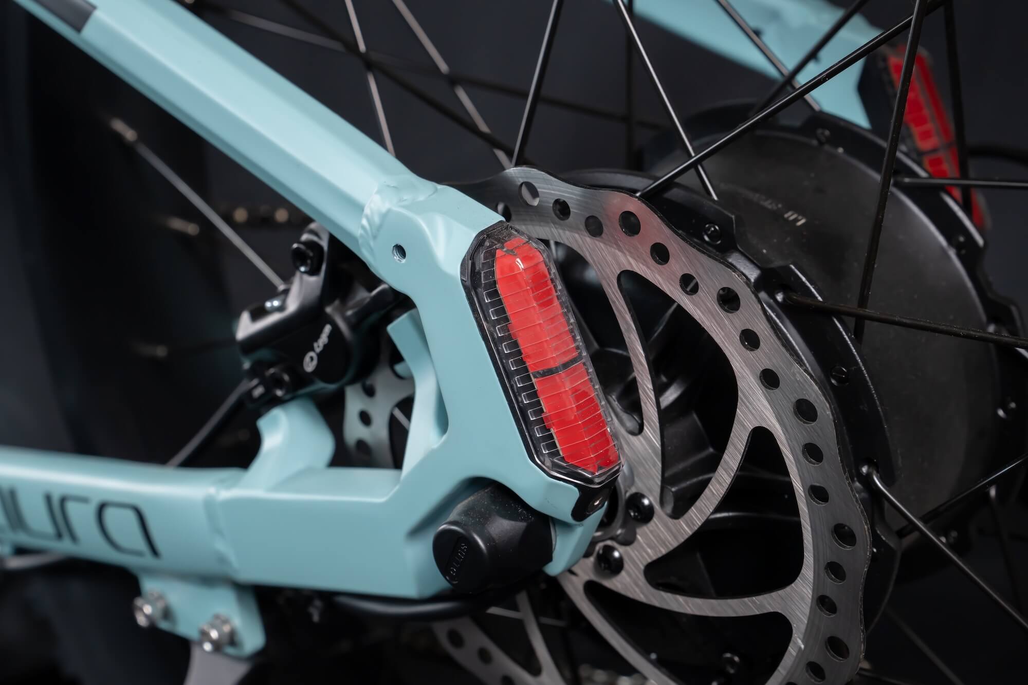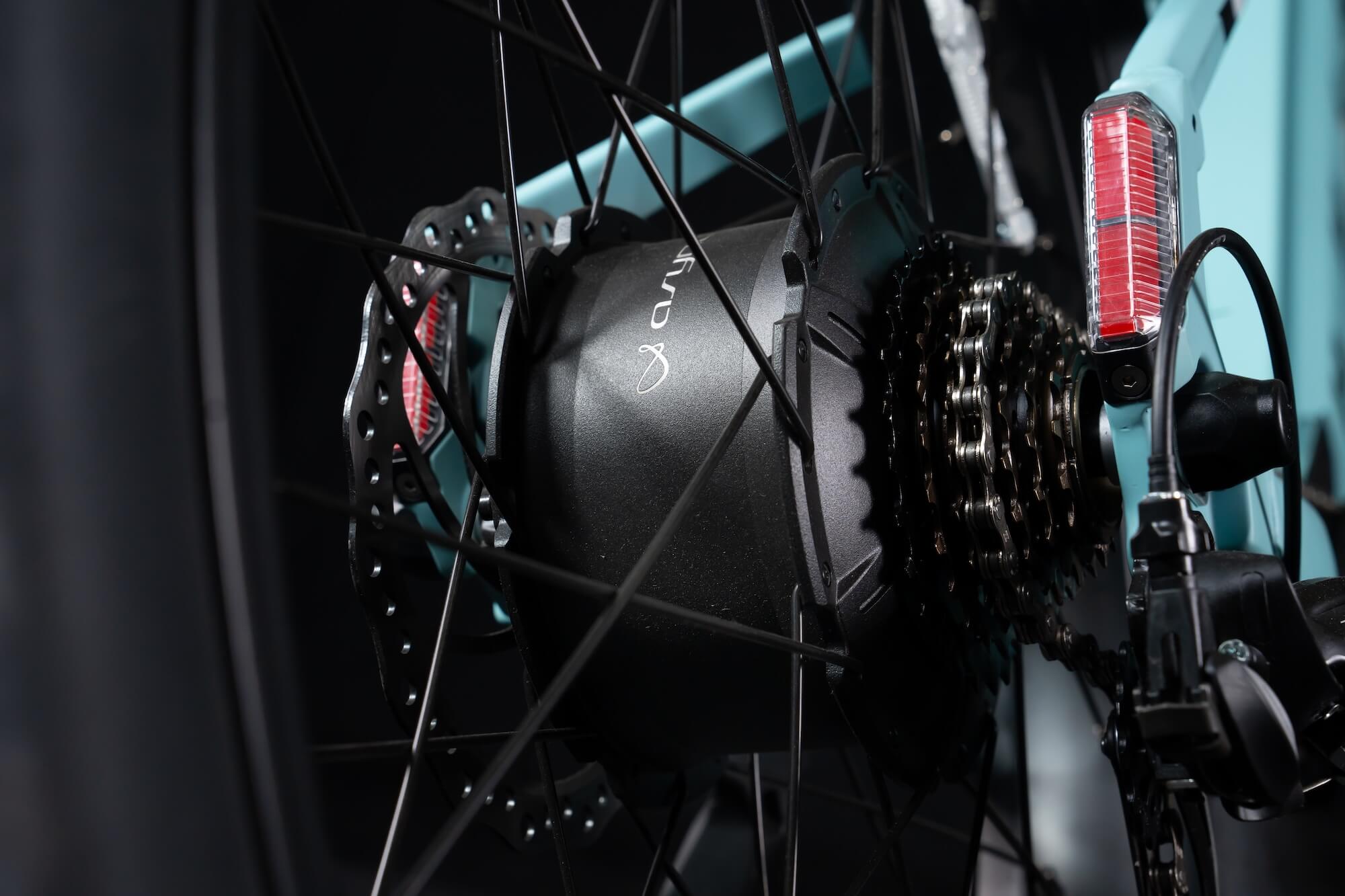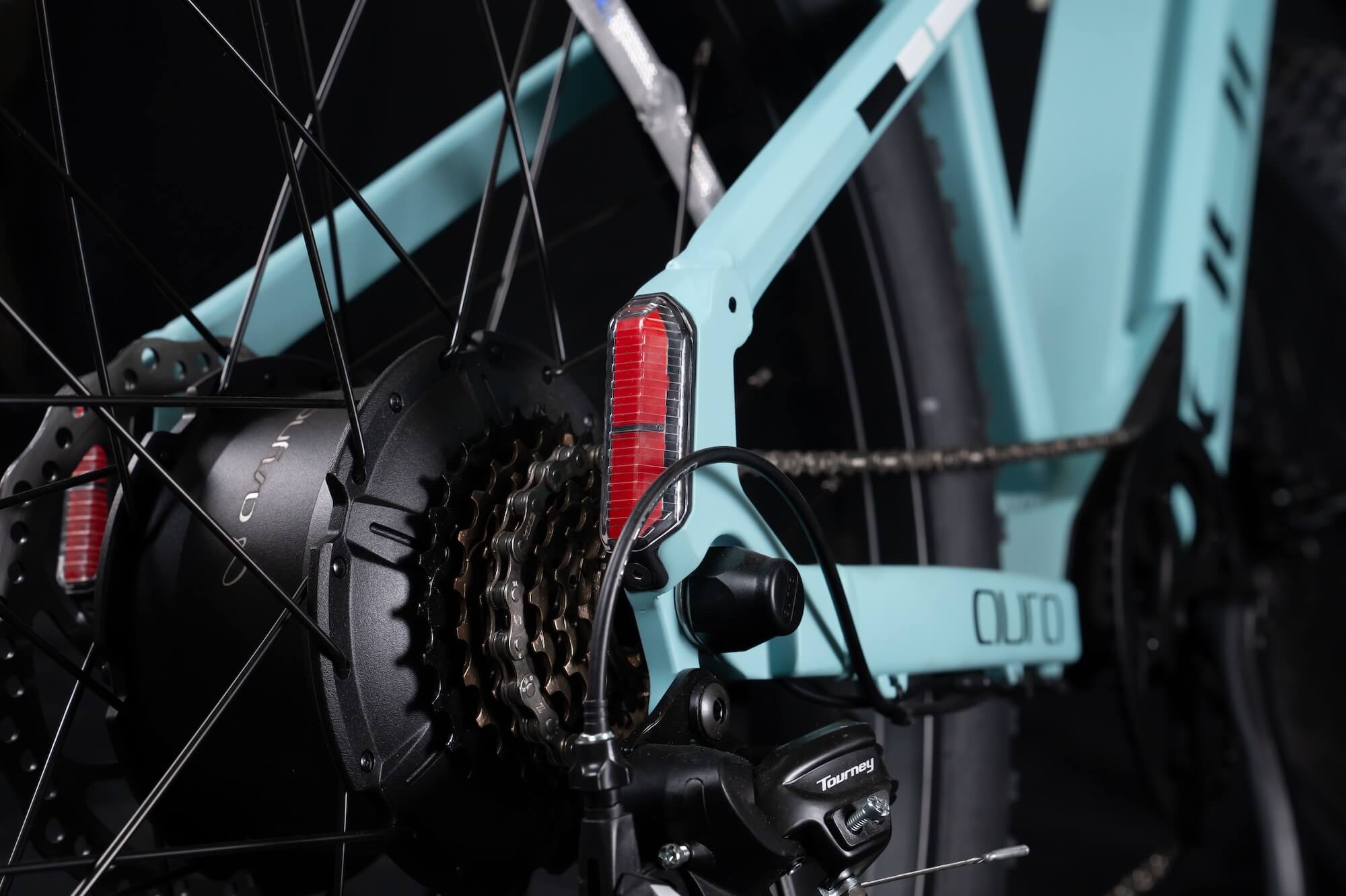 Der Aura ist mit einem 7-Gang-Schaltwerk ausgestattet, das sanfte und präzise Gangwechsel ermöglicht. Die integrierten Rücklichter bewahren das schlanke Design des Fahrrads.