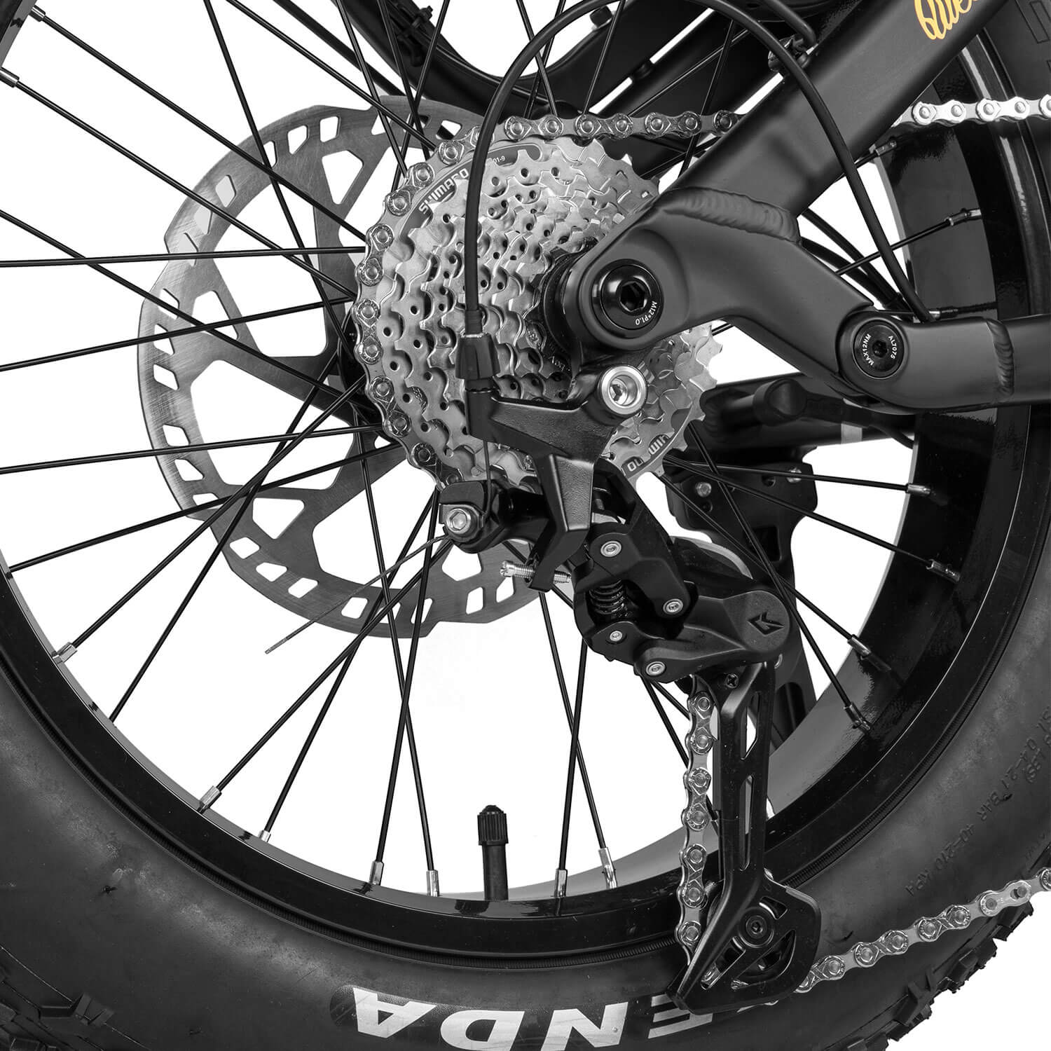 Mit dem fortschrittlichen Bremssystem des Quest steht die Sicherheit an erster Stelle. Die Starunion 4-Kolben-Hydraulikbremsen mit 203-mm-Scheiben bieten eine überragende Bremsleistung, mit der Sie steile Abfahrten und unerwartete Hindernisse mit voller Kontrolle bewältigen können. Dieses Bremssystem ist so konzipiert, dass es auch unter extremen Bedingungen zuverlässig funktioniert und Ihnen bei jeder Fahrt Vertrauen gibt. Darüber hinaus sorgt die Bafang 52T-Kurbelgarnitur in Verbindung mit einer Shimano 9-Gang-Schaltung für reibungslose und präzise Schaltvorgänge, was sowohl die Sicherheit als auch das Fahrgefühl verbessert.