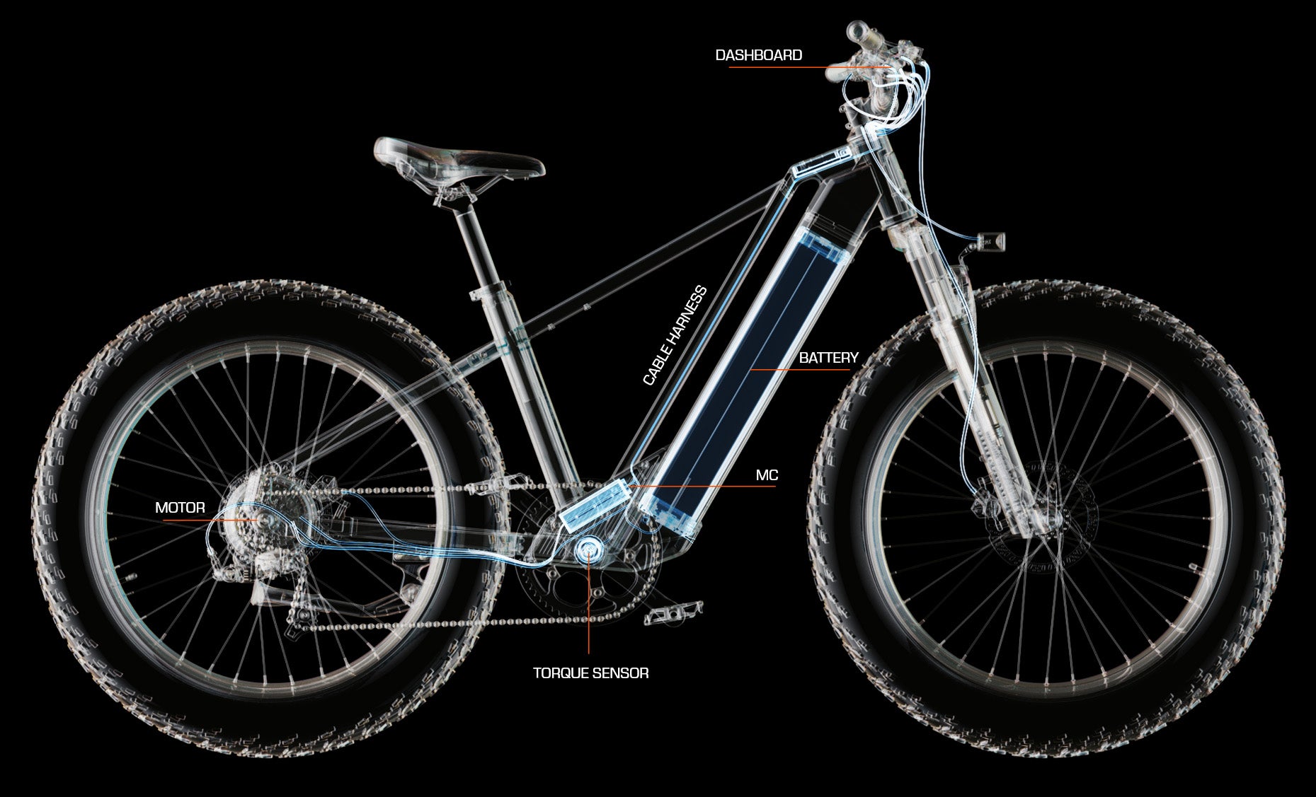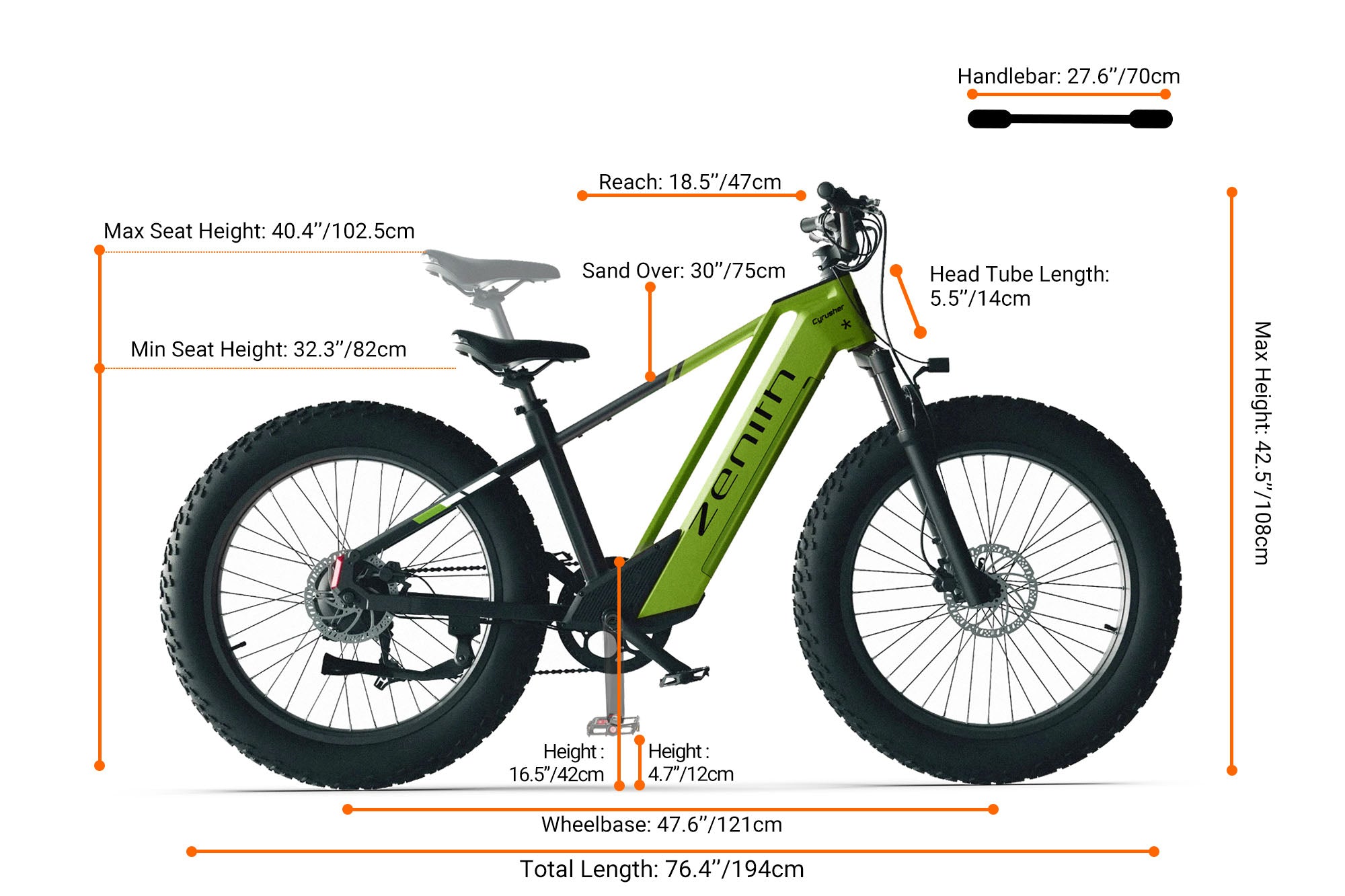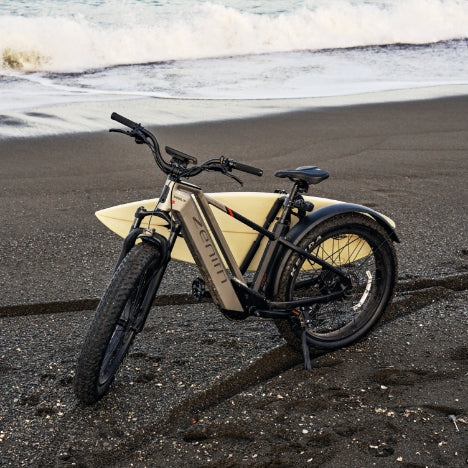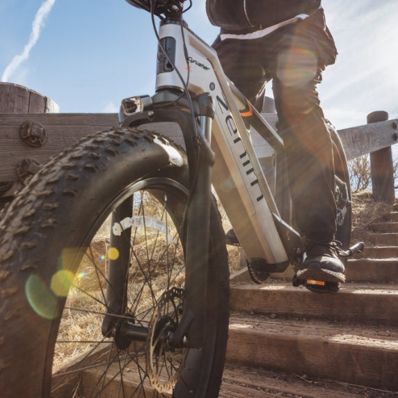 Ride through any surface with the Zenith's suspension and 26" * 4.0" tires and suspension. Rain or snow, fear not. The bike is IPX5 waterproof (some parts IPX7 waterproof).